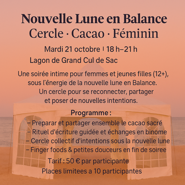 Ven 17-Apr-2026 18:00 21:00 | Lagon de Gand Cul de Sac | Inscrits : 0 / 10 Minimum : 6 | Intervenant(s): Solene, Kristine, Nouvelle Lune en BalanceCercle · Cacao · Féminin Vendredi 17 avril | 18h–21h Grand-Cul-de-Sac · Tente sacrée au bord du lagon Une soirée intime pour femmes et jeunes filles (12+), sous l’énergie de la nouvelle lune en Balance. Un cercle pour se reconnecter, partager et poser de nouvelles intentions. Au programme : – Préparer et partager ensemble le cacao sacré – Rituel d’écriture guidée et échanges en binôme – Cercle collectif d’intentions sous la nouvelle lune – Finger foods & petites douceurs en fin de soirée Tarif : 50 € par participante Places limitées à 10 participantes Venez avec votre fille, votre sœur, une amie ou une complice – un binôme féminin avec qui partager ce moment unique. Une soirée intime de cercle féminin autour du cacao sacré et de la Nouvelle Lune en Balance, pour partager, se reconnecter et poser ses intentions. Prévoir une bouteille d’eau et une tenue confortable (un petit plaid ou châle conseillé, les soirées peuvent être un peu fraîches).Réserver |